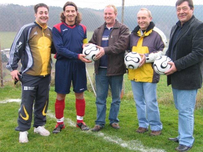 Das Bild zeigt die Spender bei der Übergabe der Bälle an den Spielführer der 1. Seniorenmannschaft, Timo Tischler, und den Vorsitzenden des SV Mossau, Christoph Reeg. V.l.n.r.: Christoph Reeg, Timo Tischler, Michael Rihm (Grünwerk), Jürgen Walther (Schreinerei Walther) und Wolfgang Reeg (Bauunternehmen Gebrüder Reeg).