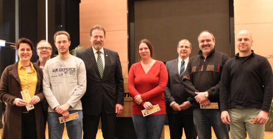 Genau 61 neue Ehrenamtskarten hat der Odenwaldkreis am 19. Februar 2015 im Haus der Energie in Erbach als Zeichen des Dankes für bürgerschaftliches Engagement vergeben. Landrat Dietrich Kübler begrüßte die entsprechend große Schar der ehrenamtlich tätigen Bürgerinnen und Bürger, die von nun an jene rund 1.500 Vergünstigungen in Anspruch nehmen dürfen, die mit der E- Card verbunden sind. Das Plus des Dokumentes im Scheckkartenformat liegt in der landesweiten Gültigkeit und Nutzbarkeit, wie Kübler hervorhob. Dabei erstreckt sich die Bandbreite auf kommunale Angebote ebenso wie auf solche im Einzelhandel, bei besonderen (kulturellen) Aktionen oder Veranstaltungen bis hin zu freiem Eintritt ins Kino oder Schwimmbad. Der Kreis-Chef rechnete vor, wie sich der Wert des uneigenützigen Einsatzes im Dienste der Allgemeinheit in Zahlen bemessen lässt: Gehen die neuen E-Card-Inhaberinnen und -Inhaber wöchentlich je fünf Stunden ihrem Hobby nach, kommen – orientiert am Mindestlohn von 8,50 Euro – in der Woche 2.592,50 Euro zusammen und übers Jahr schließlich die stolze Summe von 134.810 Euro. Deshalb, so der Landrat, könne die für eine Laufzeit von drei Jahren ausgestellte Ehrenamtskarte nur ein kleines Dankeschön eher symbolischen Charakters sein. Mit den aktuell vergebenen Ausweisen können derzeit im Odenwaldkreis rund 500 Personen deren Vorteile genießen. Im Kreisgebiet sind es mittlerweile 103 Sponsorenpartner für die E-Card, die das Ehrenamt zum Beispiel mit Preisnachlässen bei Eintritt oder Einkauf unterstützen. Ein Beispiel mit Vorbild-Wirkung bietet hier die Odenwald-Therme in Bad König, die zum wiederholten Mal die neuen Kartenbesitzer mit einem Tagesgutschein für einen Besuch ihrer Einrichtungen bedachte. Vor der Überreichung der E-Cards hatten Vorstand Thomas Mergenthaler und Sebastian Schweikert vom Immobilienmanagement der gastgebenden Energiegenossenschaft Odenwald (EGO) die Besucher in zwei Gruppen über das Areal der EGO und durch das Hauptgebäude geführt. Mergenthaler ließ per Powerpoint-Dokumentation umfassend-aufschlussreiche Erläuterungen über den beträchtlichen Wirkungskreis des Unternehmens folgen, angereichert mit einem energischen Bekenntnis zum Flächennutzungsplan Windkraft von Kreis und Kommunen.