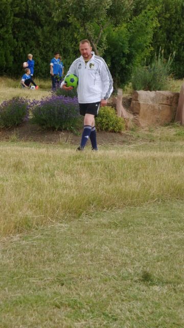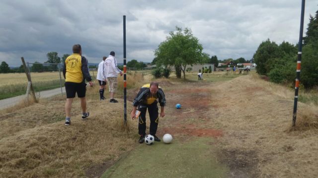 Der nächste Tag stand ganz im Zeichen des Soccergolf - einer Mischung aus Fussball und (Mini-) Golf. Ziel hierbei ist es, einen Fussball über eine Bahn mit und ohne Hindernisse (die Länge variiert zwischen 30 und 240 Meter) ins Loch zu befördern. In Dirmstein befindet sich hierzu einer der (noch) wenigen Fussballgolfplätze Deutschlands. Die Runde auf dem 18-Lochplatz dauert rund 3 Stunden. Nachdem am Vorabend die Teams "ausgekegelt" wurden, musste so mancher feststellen, dass es gar nicht so einfach ist, den Ball auf der Bahn zu halten, bzw. die Hindernisse z.B. in Form von kleinen Bäumen zu überwinden. Dennoch kamen auch ungeahnte Stärken zum Vorschein, aber gerade auch beim Einlochen zeigte sich die Nervenstärke der erfahrenen Generation…! Anschließend lud die Beach-Bar bei angenehmen Temperaturen und bestem Wetter zum Verweilen ein. Erst in der Abenddämmerung wurden die AH bei ihrer zweiten Runde Fussballgolf (jetzt allerdings auf der kleinen Runde) nochmals sportlich aktiv, ehe ein gemütlicher Ausklang auf dem Weinfest des Weingut Hilz in Dirmstein und die Musik der Band "Cat Pac" den Ausflug gelungen abrundete.