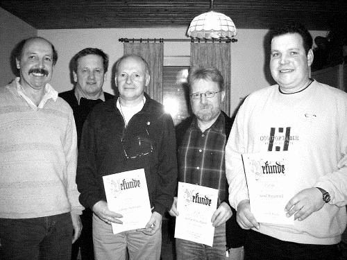 Das Bild zeigt: v.l. Adolf Schork (1.Vors.), Wlli Keil (Bürgermeister), Günther Hartmann (40 Jahre), Helmut Kriechbaum (40 Jahre), Bernd Morgenroth (40 Jahre)