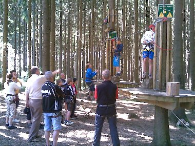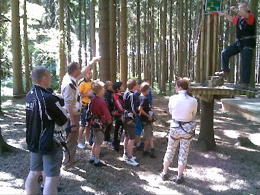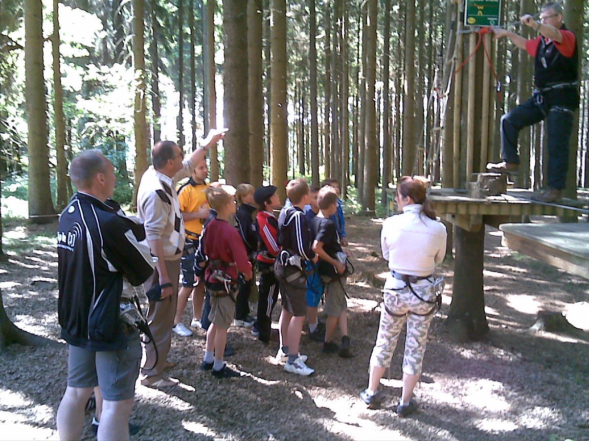 Am Samstagvormittag fuhren unsere Gäste mit einigen Betreuern der SG in den Kletterpark nach Würzberg. Nachdem sich in ungewohnten Höhen alle gut geschlagen hatten, gab es im Sportlerheim den letzten Bundesligaspieltag zu sehen, ehe sich beide Jugendmannschaften im Spiel um den Jumelage-Wanderpokal gegenüberstanden, den die SG im letzten Jahr nach einem Sieg im Siebenmeterschießen gewonnen hatte. Auch in diesem Jahr sahen die Zuschauer ein ausgeglichenes und spannendes Spiel, bei dem SG allerdings die besseren Chancen hatte. Lukas Kessler erzielte nach 21 Minuten die 1:0 Führung, die Richard Krjigsman im Gegenzug wieder ausgleichen konnte. Celine Pförsich gelang jedoch noch vor dem Halbzeitpfiff, der 2x30 Minuten dauernden Partie, der Treffer zum 2:1 Endstand. Die SG, die in der Besetzung Tom Hendrik Herzog, Alessandro Sturm, Lukas Kessler, Jens Michel, Amir Sejaric, Gregor Kumpf, Lukas Kaufmann und Celine Pförsich spielte, konnte damit den Pokal im Mossautal behalten. Schiedsrichter war auch hier Alexander Schmidt. Nach der Begegnung hatten die Spieler, Betreuer und Angehörige der Kinder noch einen gemütlichen Abend im Sportlerheim.