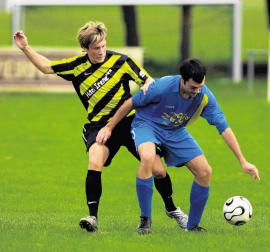 Hintermann: Joscha Kepper (FV, hinten) bedrängt den Gammelsbacher Daniel Pracht. Im Odenwälder Kreispokal trafen gestern Abend die beiden Fußball-A-Ligisten FV Mümling-Grumbach und SV Gammelsbach aufeinander. Der FV behielt mit 3:2 die Oberhand. Foto: Guido Schiek |