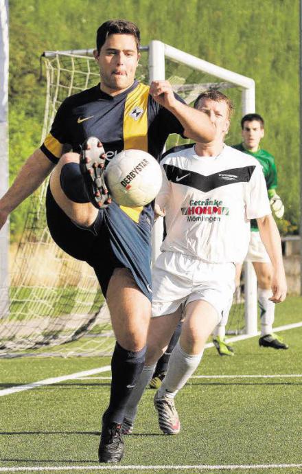 Ballbesitz für den VfL Michelstadt III: Fabian Weickert (vorn) hat gegen den Hainstädter Oliver Spengler alles unter Kontrolle. Nach dem 4:0-Heimsieg spricht vieles für den Klassenerhalt der Michelstädter. Das Rückspiel ist am morgigen Samstag. Foto: Herbert Krämer