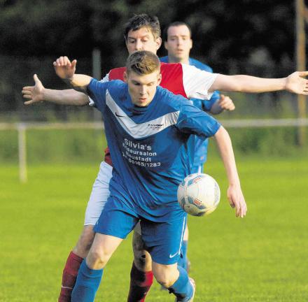 Vorteil TSV Hainstadt: Felix Schwarz verteidigt den Ballbesitz gegen Michael Hammann vom VfL Michelstadt III. Trotz eines 3:0-Heimsiegs scheiterte der TSV Hainstadt II in der Relegation. Foto: Guido Schiek